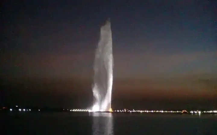 تقع النافورة على الكورنيش، وتطلق المياه بارتفاع يصل إلى 312 متراً يمكن رؤيتها في جميع أنحاء المدينة.