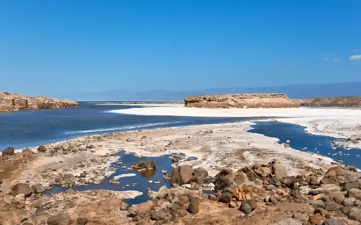 تتألق مياه بحيرة عسل بلونها الأزرق العميق المحاط ببلورات الملح البيضاء اللامعة، مما يخلق مشهدًا سرياليًا يخطف الأنفاس.