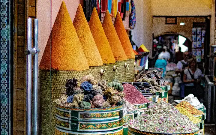 يشتهر سوق جامع الفنا في مراكش بمنتجاته اليدوية مثل الفخار، والجلود، والمنسوجات. تجربة التسوق في مراكش أقرب إلى رحلة روحية في عالم الألوان والعطور.