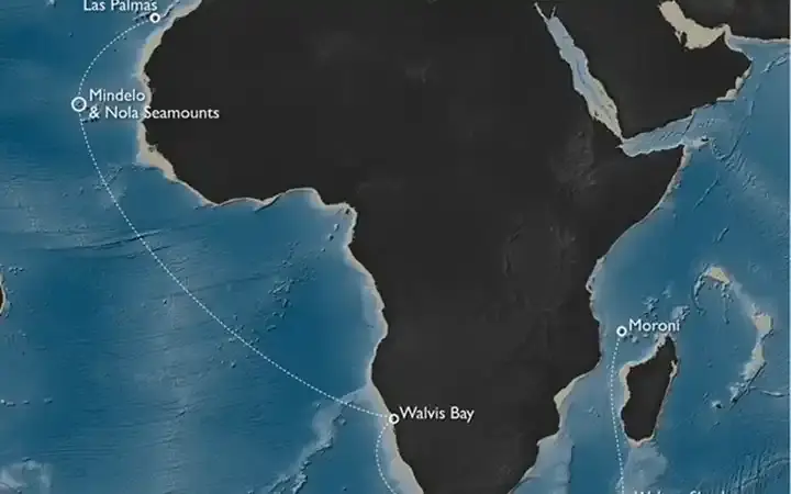 • المحيط الهندي (سلسلة الجبال البحرية من جزر القمر إلى رأس أخضر) عبر بعثة أفريقيا.