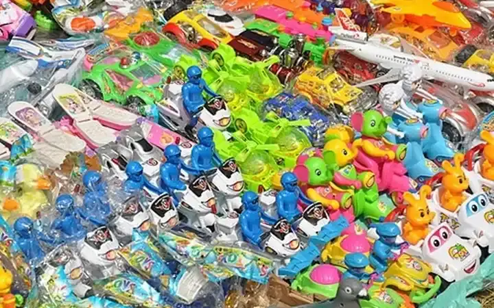 عدد كبير من الألعاب البلاستيكية (أو قطعها) تنتهي في البحر، وأحياناً في معدة الطيور البحرية التي تُميتها