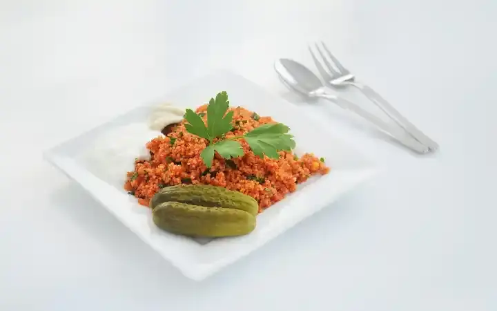 نقوم بنقع البرغل في الماء المغلي ويغطى لمدة 15 دقيقة أو أكثر قليلا. علي طاسة يحضر صوص السلطة نضيف الزيت ثم البصل ويقلب حتى يذبل لونه قليلا ثم يضاف معجون الطماطم ويقلب ثم معجون الفلفل الحار مع الاستمرار في التقليب لبضعة دقائق ثم نضيف التوابل ونخلطها جيدا مع الصوص ويرفع من النار. نقلب البرغل جيدا حتى نتأكد من عدم وجود تكتلات ثم يضاف الصوص ساخن للبرغل ويقلب جيدا.
