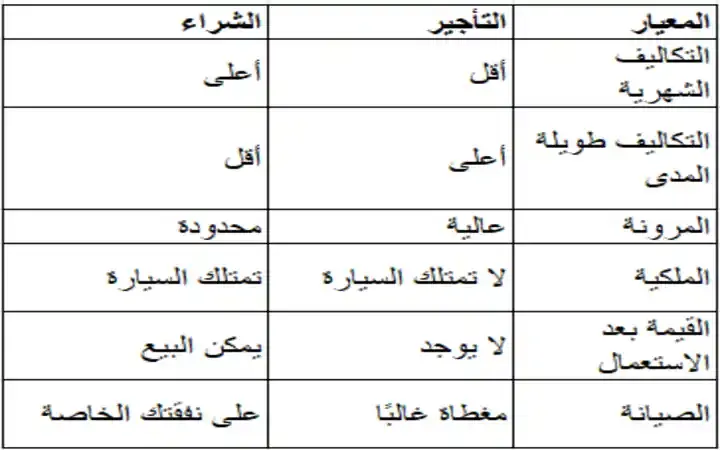 لا تحصل على أي قيمة متبقية، فالسيارة تعود إلى الشركة بعد انتهاء العقد. هذا قد يُنظر إليه على أنه استنزاف مالي لا يؤدي إلى تملك أصل ملموس.