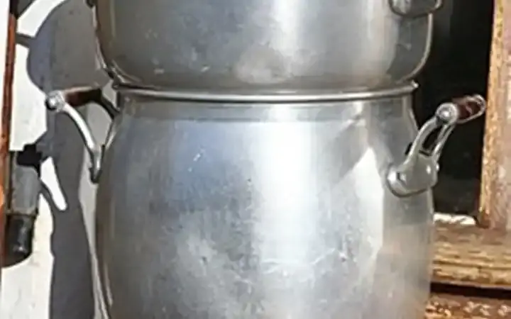 ب. الطهي على البخار لأول مرة (20-30دقيقة): تسخين المرق فوق نار هادئة في قدر الكسكس.