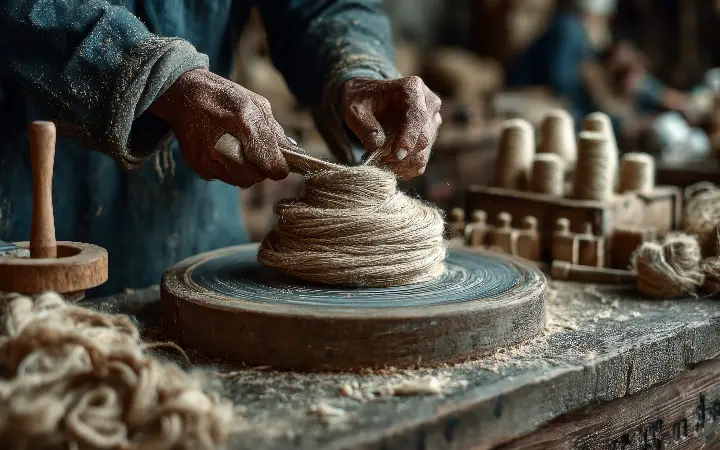 حرفي يلف الخيوط باستخدام عجلة دوارة