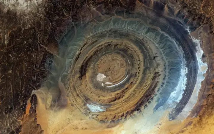 عند النظر من الفضاء يظهر تكوين جيولوجي دائري ضخم جدا أثار العلماء وسموه عين الصحراء أو قلب الريشات . يعتقد العلماء أنه نتج عن إصطدام نيزك بالأرض و يشبه العين البشرية.